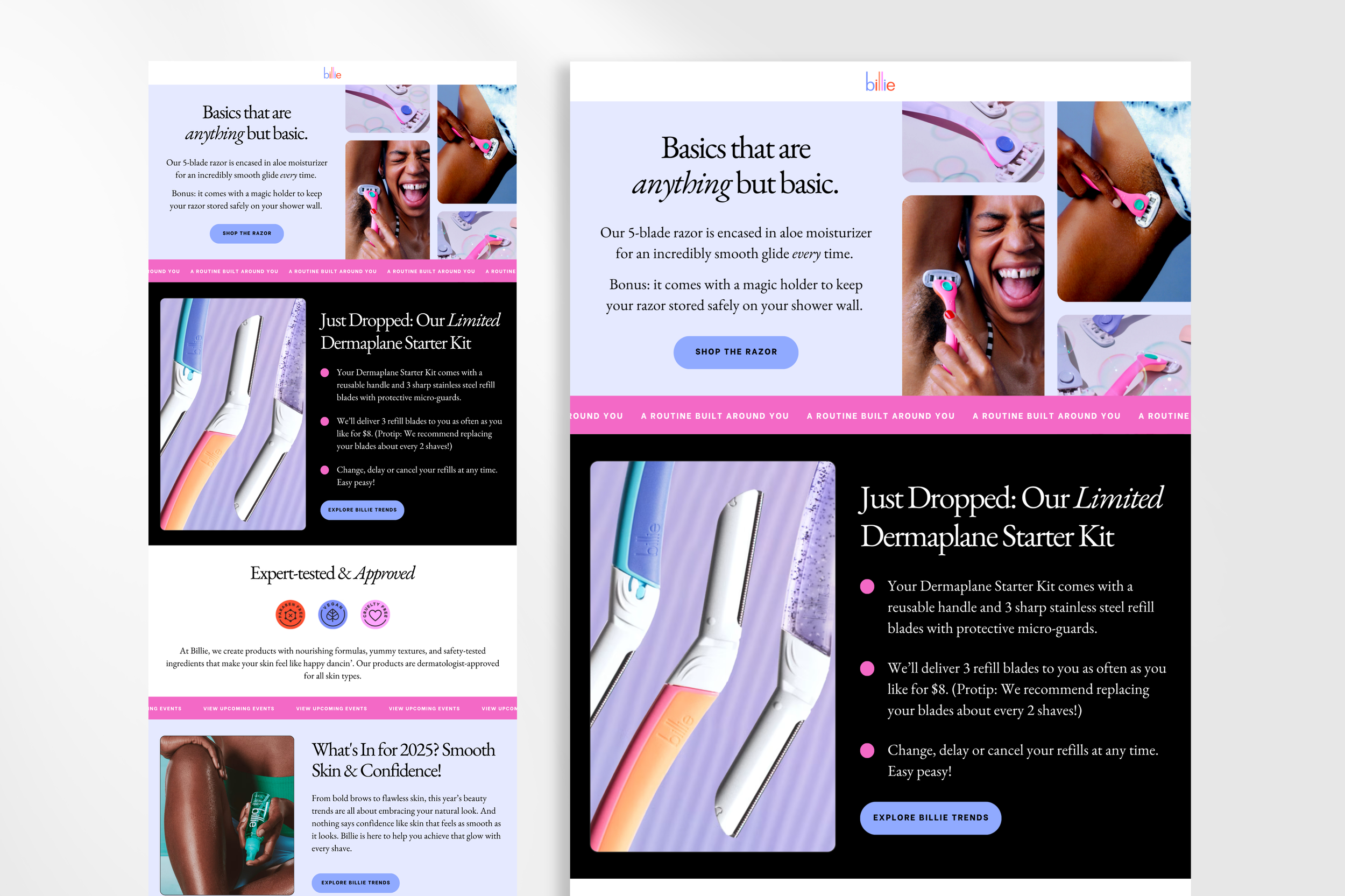 Digital Assets: In addition to social media, Billie needed a variety of digital assets to support their ongoing marketing campaigns across emails, websites, and other touchpoints. Our team delivered high-quality, versatile email templates and digital ads that aligned with the newly developed brand identity, providing Billie with the tools to execute their marketing strategies seamlessly.
